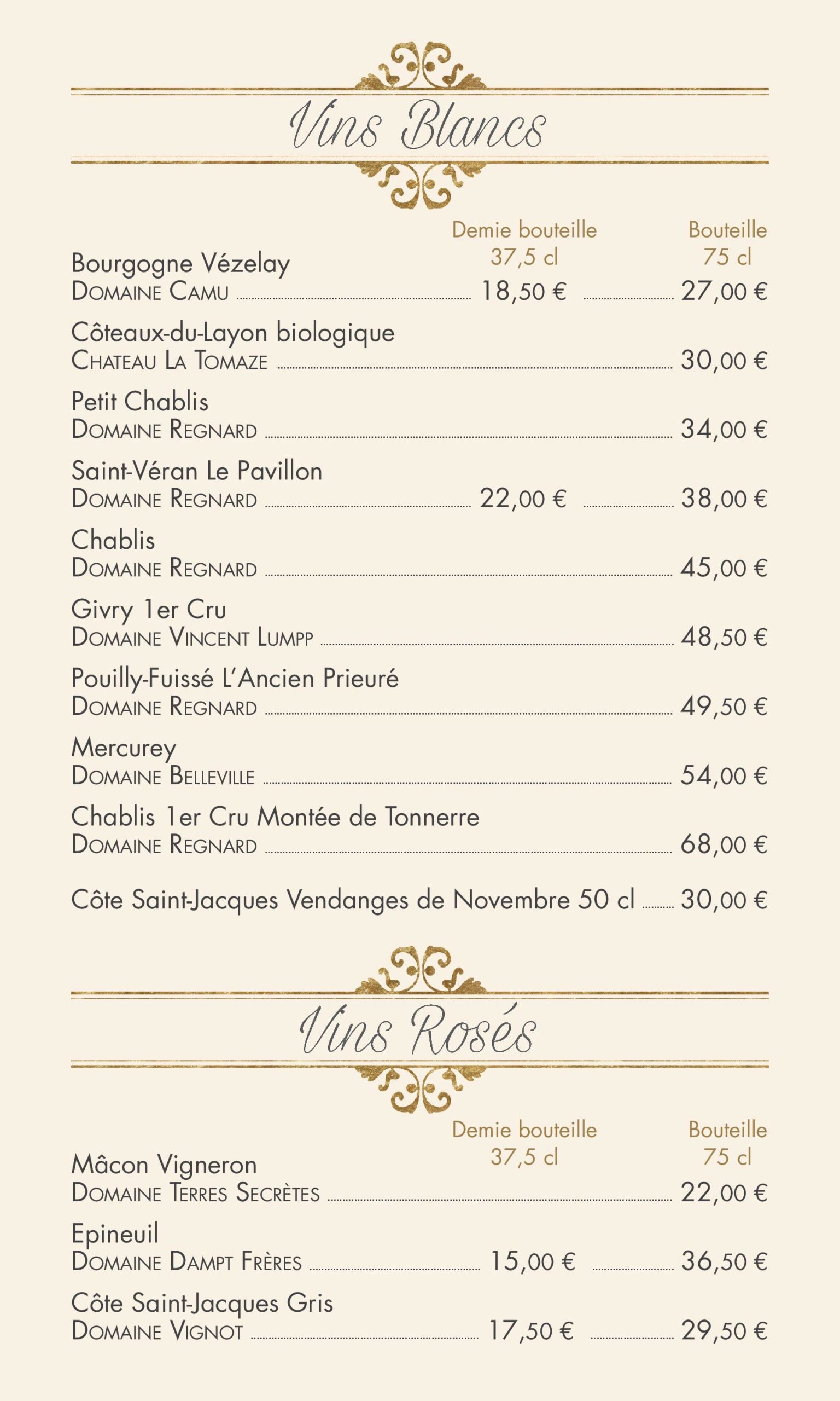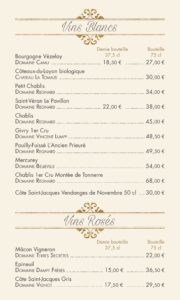 carte des vins et boissons