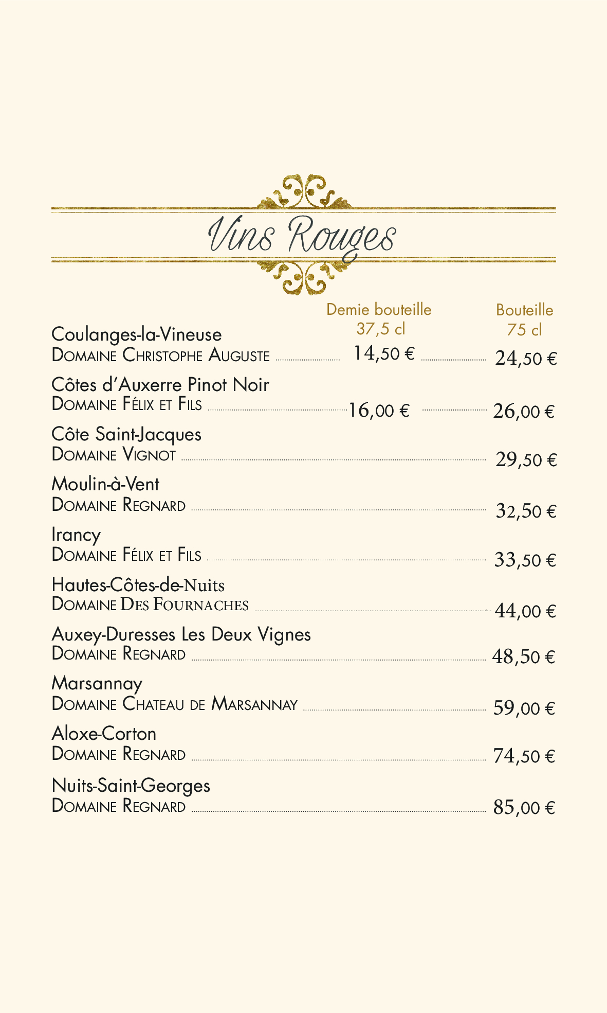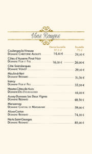 carte des vins et boissons